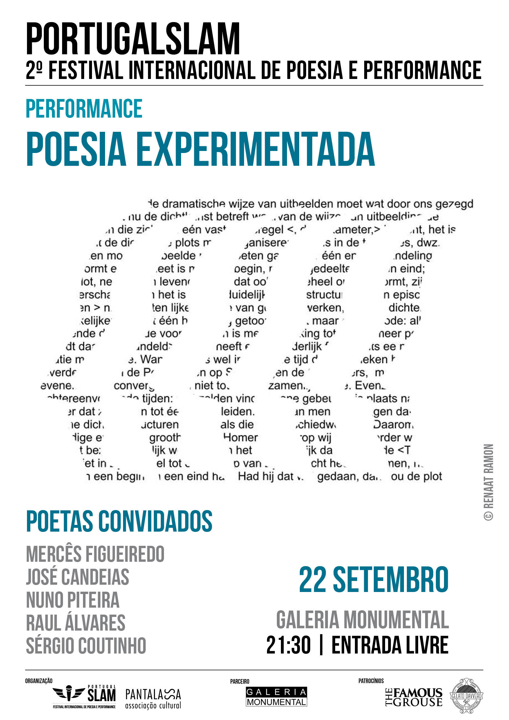 A Galeria Monumental acolhe a performance “Poesia Experimentada”, no dia 22 Setembro, pelas 21:30. Aqui, os poetas convidados apresentam a percepção em corpo e devolvem o silêncio pela voz, rodeia-nos as palavras e o gesto, as letras que saltam dos bolsos, o público faz parte do espectáculo, dos sólidos silêncios aos silêncios visuais, uma nova experiência é garantida.